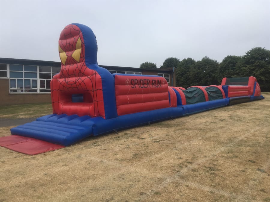 The Spider Run Assault Course is 12ft wide, 90ft in length and stands 13ft high. The course involves different obstacles, after diving through the chest of the Spiderman make your way through the biff and bash pillars that come at you from every direction. Then its under a wall and into the tunnel section. After a short crawl, its back up for even more obstacles to get through before you climb a set of foam padded steps to go whooshing down the slide to the end.