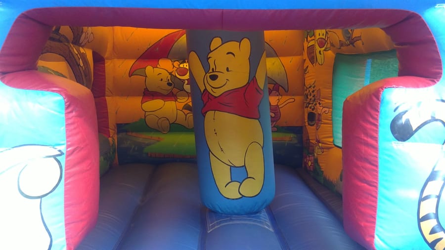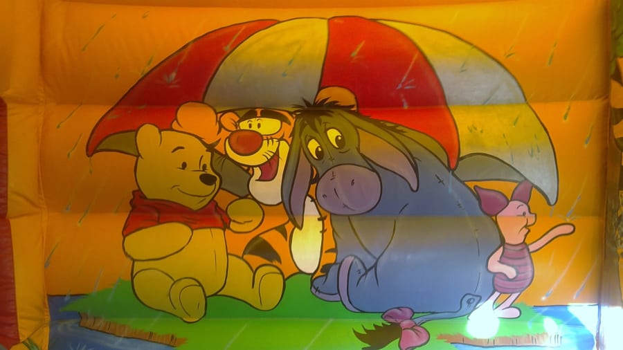 This castle has been beautifully hand decorated in the theme of Winnie the Pooh and friends. You enter through the square shaped hole into the bouncing area where there is pooh bear biff and bash to play with. Then bounce round the corner, through the rectangle hole to find the padded stairs. Climb to the top to go whooshing down the slide. The inflatable measures 13ft wide, 16ft in length and 8.5ft high. The castle comes fitted with a shower cover and safety mats are provided at the front.