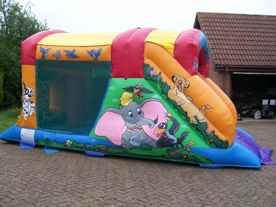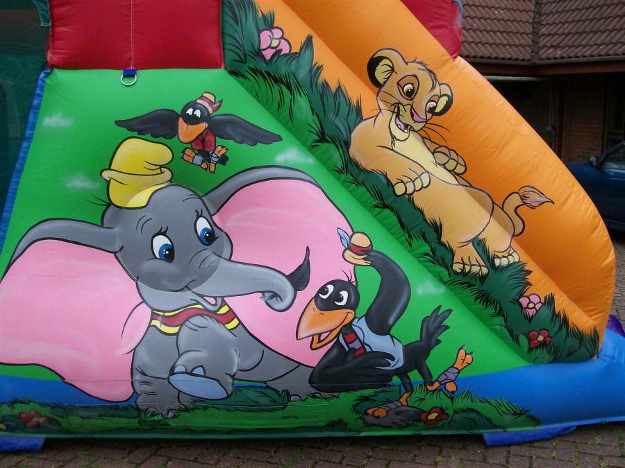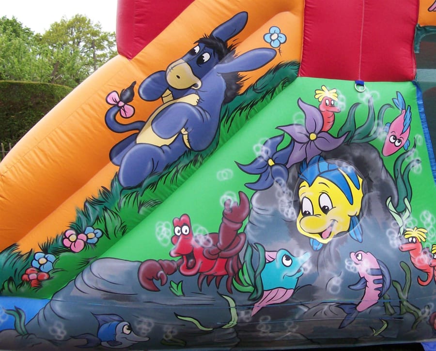 This castle has been beautifully hand painted with all your favourite characters. You enter through the holes, into the bouncing area where you will find 2 biff and bashes. Then take the climb up the scramble net to the top to go whooshing down the 6ft slide. This inflatable measures 11ft wide, 23ft in length and 13ft high.