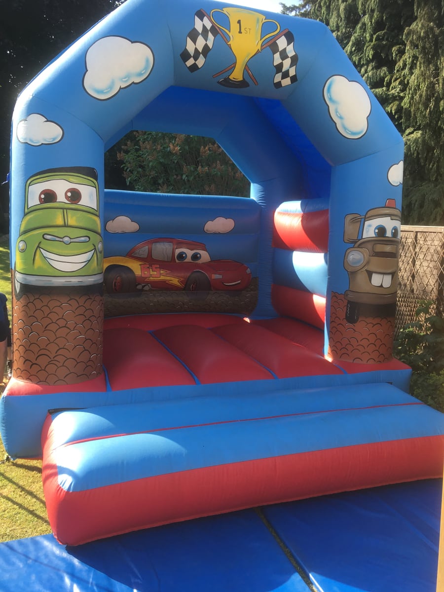 This Bouncy Castle is decorated in the theme of Hot Rod Cars and Trucks. The castle measures 11.5ft wide, 11.5ft in length and 13ft high and is suitable for children up to 4ft tall (8 years of age).