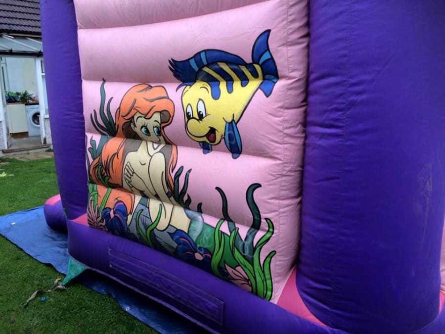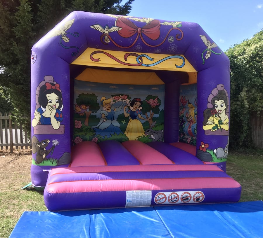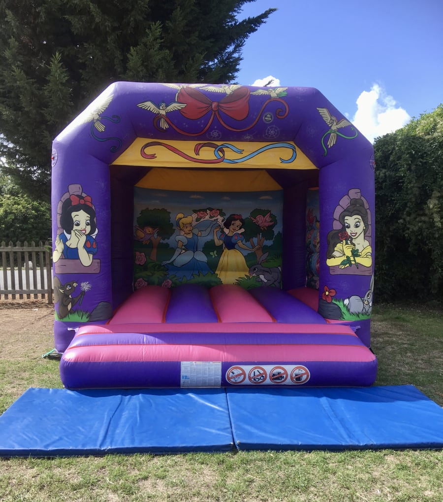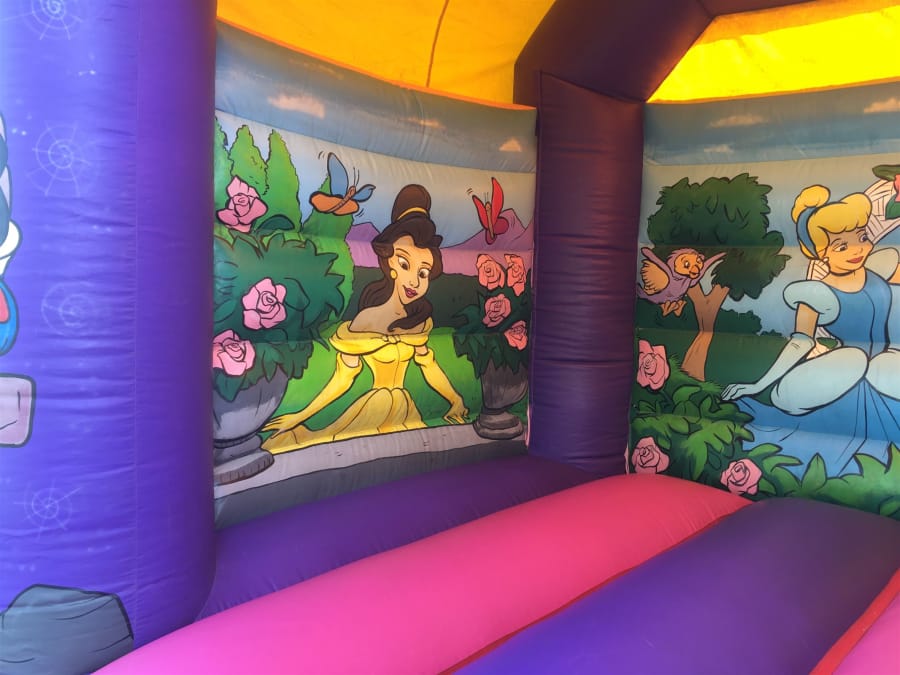 Make this a Fairy tale Party, by joining in all the fun with the Princesses on your special day. This pink and purple Bouncy Castle has been hand painted with all your favourite Princesses and is set in a picturesque fantasy background scene. The inflatable measures 12.5ft wide, 12.5ft in length and 11.5ft high. The bouncy castle is suitable for children up to 10 years of age. The inflatable comes fitted with a sewn in shower cover and is supplied with a safety mat at the front.