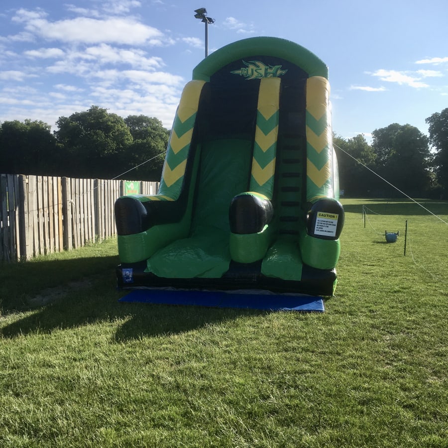 Brand New for 2023, this is our brightly coloured green and black Toxic “Rush” Inflatable Slide. Standing 20ft high and donned with toxic themed artwork, this inflatable is a real stand out piece at any school fete, inflatable fun day or party.